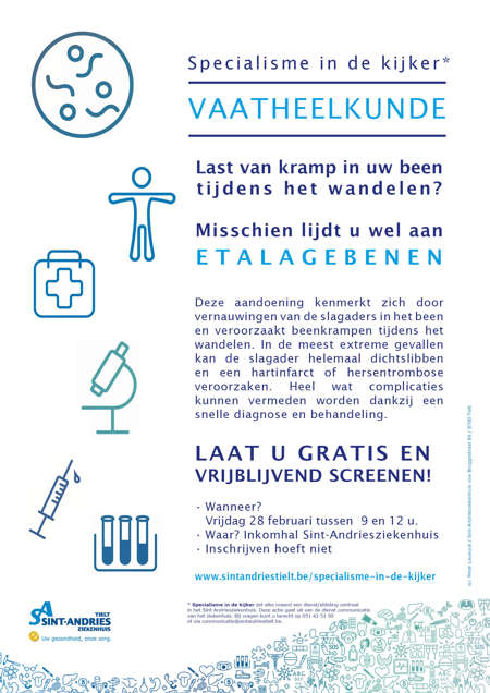 In februari staat de dienst vaatheelkunde in de kijker in het Sint-Andriesziekenhuis en vindt er een gratis screening etalagebenen plaats. Deze aandoening kenmerkt zich door vernauwingen van de slagaders in het been en veroorzaakt beenkrampen tijdens het wandelen. In de meest extreme gevallen kan de slagader helemaal dichtslibben en een hartinfarct of hersentrombose veroorzaken. Kom op vrijdag 28 februari tussen 9 en 12 uur langs en laat u gratis screenen op deze aandoening.