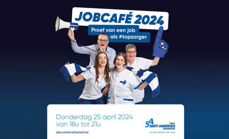 Het Sint-Andriesziekenhuis zet de zoektocht naar nieuwe #topzorgers in met een sfeervol jobcafé. Kom langs in ons restaurant op donderdag 25 april 2024 van 18.00 tot 21.00 uur en proef van hoe het is om bij ons te werken. Je krijgt een unieke rondleiding achter de schermen en kan one-on-one vragen stellen aan onze #topzorgers. Zin gekregen om aan de startlijn te gaan staan? Wij voorzien alvast een hapje en een drankje terwijl jij ter plekke je sollicitatie indient.